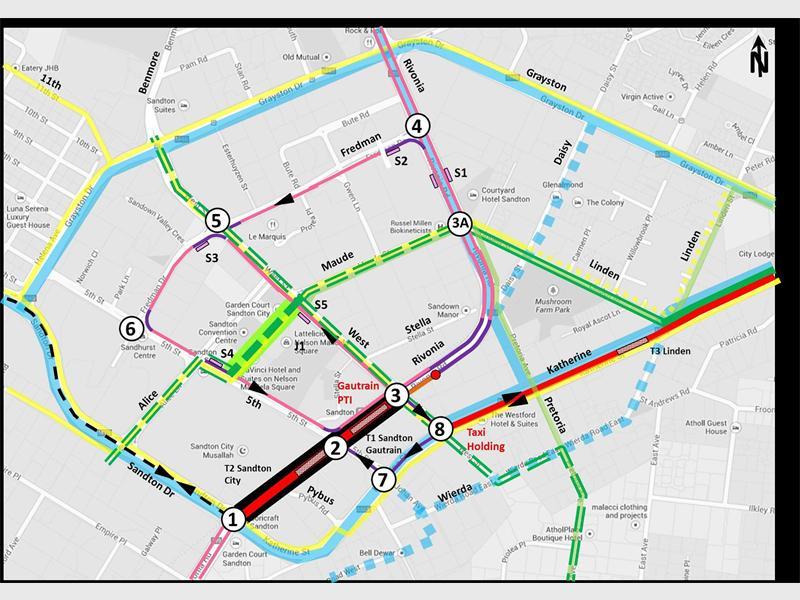 Travel plan… Sandton commuters prepare for the EcoMobility World Festival 2015 in Sandton. Seen here: Red (Rea Vaya BRT), pink and purple (public transport lanes for buses and mini bus taxis), light blue (private car mobility), yellow (improved walking) and green (cycling).