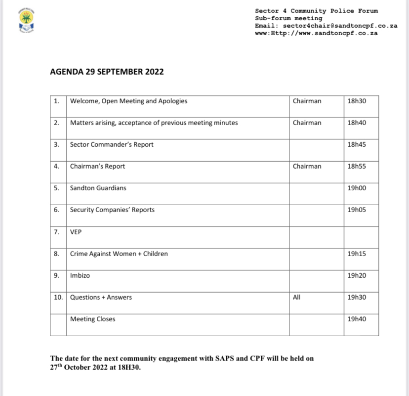 Sandton Sector 4 CPF Monthly Meeting Invitation and Agenda - DATE 29-09-2022